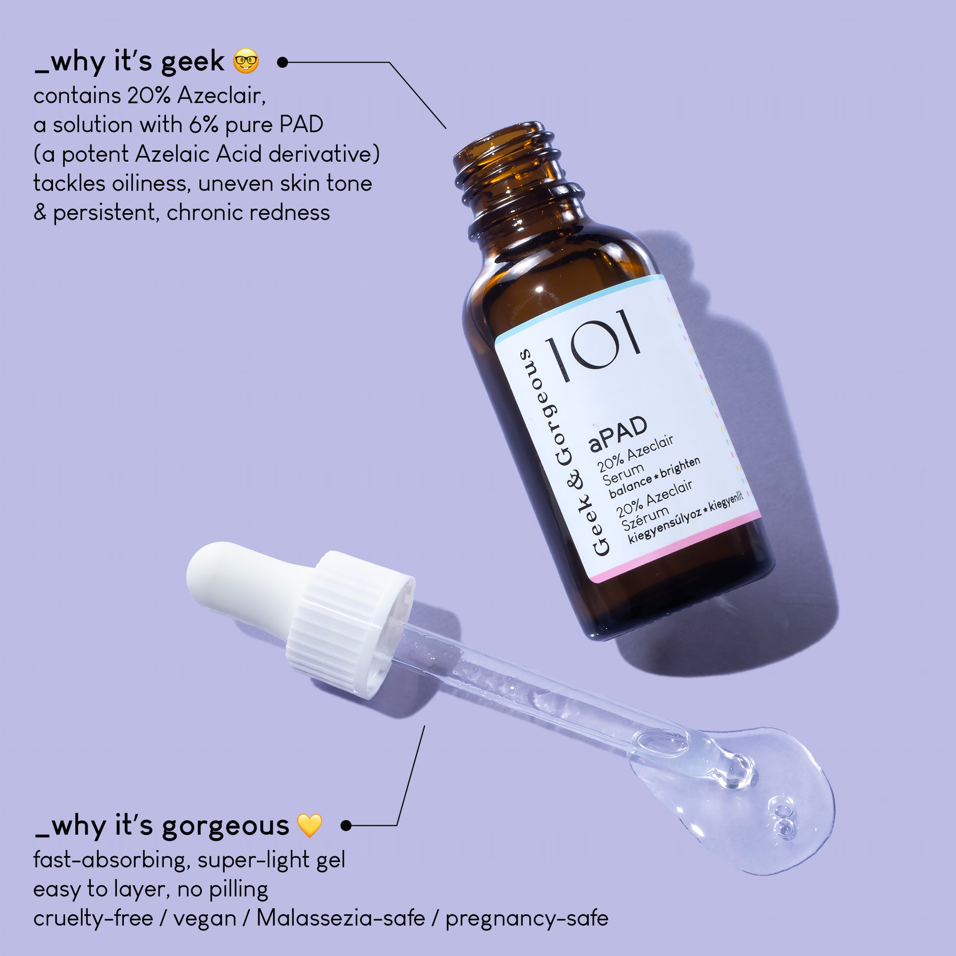 Potassium Azeloyl Diglycinate – Ein Azelainsäure-Derivat der neuen Generation, entwickelt um wasserlöslich zu sein und dadurch leichte Formulierungen zu ermöglichen. Es hat einen ähnlichen Effekt wie die 3-in-1 klinisch aktive Azelainsäure, die hilft, Unreinheiten, Pigmentierung und Rötungen zu mindern. Die zwei Stärken von PAD sind einen unregelmäßigen Teint auszugleichen und überschüssigen Ölglanz kontrollieren zu können. aPAD enthält 20% Azeclair, der Markenname der PAD Lösung, welche wir im Produkt benutzen. Dies bedeutet 6% reines Potassium Azeloyl Diglycinate. (Merke: Die Formel hat sich nicht geändert, aber wir haben den Kommunikationsfehler korrigiert, welchen wir mit aPAD gemacht haben. Wir entschuldigen uns von ganzem Herzen und haben ausführlich darüber geschrieben was da passiert ist.)